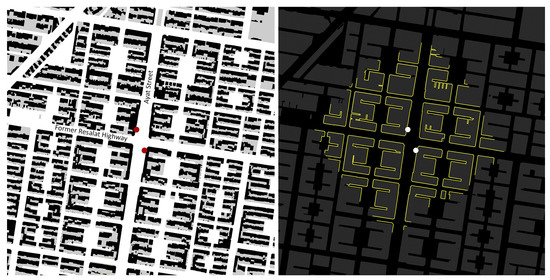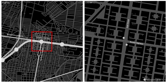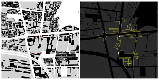 Building footprints, street network, and accessible interfaces within a 5-min timeframe (red and white dots: station entries)—(1 × 1 km). Maps: Nastaran Peimani.