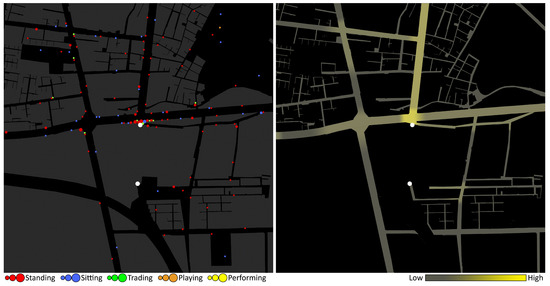 The urban ecology of the study area in the east comprises both formal and informal economies. This shows how forms of self-organised activities can loosen up the spatial striation of the public space and maximise its physical and social affordances, which are linked to the emergence of vibrant urbanity and economic productivity. Forms of street trading are often attracted to pedestrian flows that are, in turn, mediated by urban attractions and access networks [84]. These activities are clustered in proximity to the busy nodes such as metro entries and shopping centres and along the most accessible public spaces from stations. This is linked to how such self-organised activities are associated with the urban DMA (density, mix and access) as outlined by Dovey [55]—they are attracted to those areas where the morphology and functional mix afford possibilities.