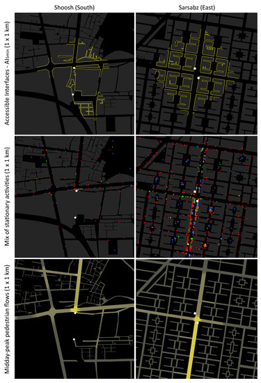 The mix of stationary activities and the midday-peak volume of pedestrian flows (1 × 1 km). Maps: Nastaran Peimani.