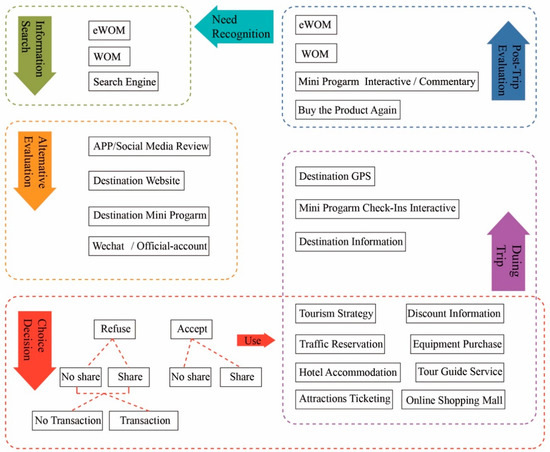 Figure 3 shows that consumers at the first stage of “need recognition” evoke the demand for traveling. The second stage is “information search”, where users search the conditions and information of their desired destination on the mini program to make an “alternative evaluation”. The third stage is “choice decision”. Through the functions of the mini program, users decide whether to visit the tourist destination and then book tickets and accommodations. “During Trip” is the fourth stage, wherein the mini program can provide instant information and assist interaction at the tourist destination. The fifth stage is the “post-trip evaluation”, which includes users using the mini program to share and evaluate the trip and purchase local products. The mini program penetrates the entire travel service circle and plays an important role in decision-making. What is more, with the function of electronic word of mouth (e-WOM), it completes a closed loop in the travel decision-making process. The role of e-WOM is similar to advertisements that cause potential tourists to achieve a virtuous cycle of tourism economic growth for tourism purposes.