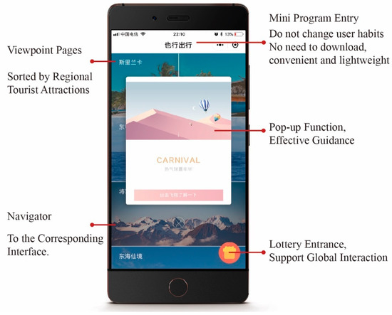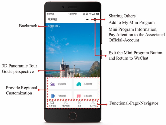 Furthermore, it provides enterprises with publicity, featuring low cost and high transformation rates, providing users with the best carrier for data collection of online travel about tourist destinations. Besides the edges of WeChat, the announced rules in its official design guideline of developing mini programs provide a set of instructions for web design and mini programs, which provides useful resources for developers and proposes visual standards on interface design including font, font color, button, and chart [47], bringing great convenience to developers. Meanwhile, compared with various apps, the integration of the user interface (UI) of WeChat mini programs and operation procedures improves user’s usability.