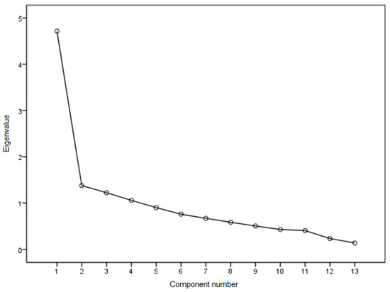 Before the EFA, the authors extracted the scree plot (see Figure 1). This graph provided an initial approach that identified four factors or dimensions. These four dimensions could be observed by the existence of three turning points: a first and evident turning point in Element 2 and two slight turning points matching more with Elements 11 and 12.