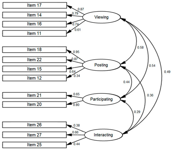 The internal consistency of the items comprising the first factor (viewing) showed a Cronbach’s alpha of 0.831. The items included in the second factor (posting) presented a Cronbach’s alpha of 0.798. The internal consistency for the third factor (participating) showed a value of 0.684. The items of the fourth factor (interacting) had a Cronbach’s alpha of 0.604. According to Kerlinger and Lee [58], reliability coefficients between 0.600 and 0.850 for each of the constructs are considered optimal. Similarly, the reliability of the instrument as a whole also had a satisfactory overall coefficient of 0.864.