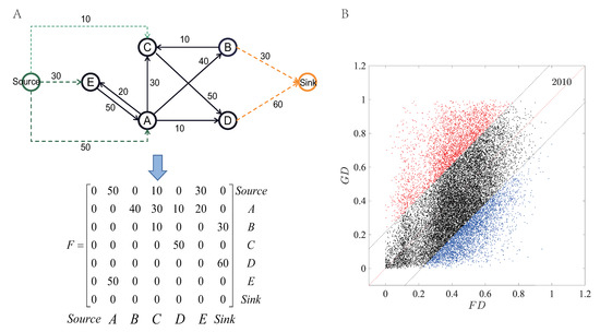 In the ITFN system, the relationships between a country and the two special nodes are defined by network balance principle: the total in-flow of each node equals its total outflow except for the sink and the source, i.e., . In some cases, the data for domestic productions and consumptions are not available. We replace these flows as the non-balanced trade flows. If a country’s total import value is larger than the total export (i.e., ), the net import can be the surrogate as the domestic consumption: the flow from i to the sink (i.e., orange dashed lines in Figure 1A). The net export represents the countries’ production: the flow from the source to i (i.e., green dashed lines in Figure 1A). By doing this, the element in the adjacency matrix of the flow trade network F is obtained, as follows: