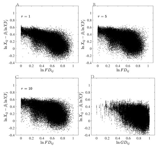 In this section, a detailed analysis focuses on the performance of flow distances to predict trade flows. To avoid endogeneity, we use a lagging distance variable (that is, flow distances with time delay feature) to replace the geographical distance in the classical gravity model. In doing so, flow distances at time are used as effective trade distance to predict trade flow at t time, and the flow distance under different delay coefficients are compared with the regression results of geographical distance. A more intuitive comparison scheme is first adopted. We plot logarithmic distance both for geographical (Figure 2D) and flow distances with (Figure 2A–C) against (the item of non-distances).