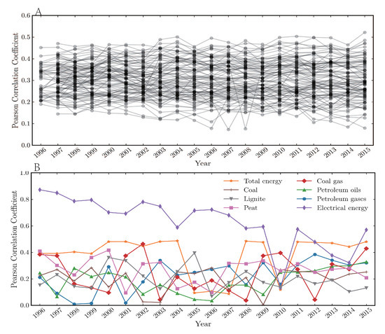 Correlation analysis of flow distances and geographic distances: (A) the correlation coefficient evolution of flow and geographical distance in all products; and (B) the correlation coefficient evolution of flow and geographical distance in more detailed energy products.