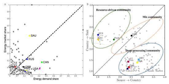 To illustrate the validity, we furthermore provide the community structures of economic data by energy market share and demand share in Figure 4A. The results show that the flow distances plane can categorize the characteristics of international status clearer than the market and demand share. The energy market share and demand share are measured by the value of energy net exports and domestic energy use (kg of oil equivalent per capita), respectively. Especially, Russia and Canada fail to be effectively identified in the resource-driven community. Although the input–output structure and relative magnitude of production among sectors are not explained by trade status only, the theory of complex economy points that there are many unmeasurable factors, including infrastructure, education, vocational skills, and other factors, hidden behind economic behaviors. Those non-monetary metrics, based on trade network structures, have greatly enriched the theory of economy. Those unmeasurable factors are thus reflected in the country’s export capacity, i.e., trade data.
