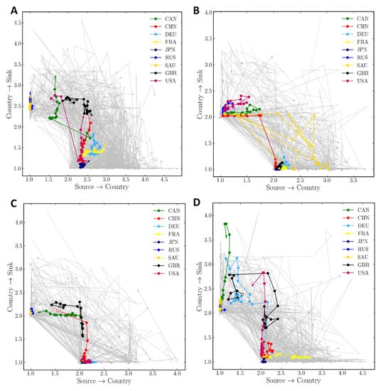 The evolution of status and contribution of nations in the flow space: (A–D) the evolution of the status in the energy, coal, natural gas, and oil markets, respectively, for the years 1996–2015. The arrow indicates the country’s evolution direction in the two-dimensional plane. For each point in pictures, the position is determined by the S2C distance and C2S distance.