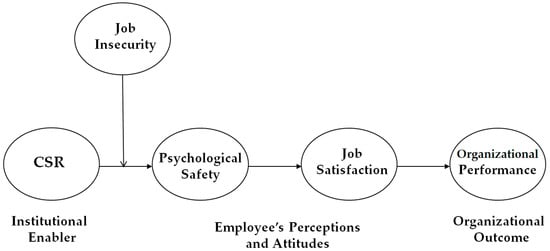Relying on the above arguments about the associations among our research variables (i.e., CSR, psychological safety, job satisfaction, and performance), the current research suggests that the relationship between CSR and performance may be sequentially mediated by the level of employee psychological safety and job satisfaction. The associations can be explained by institutional theory [53]. This theory suggests that micro-variables (e.g., organizational member’s perceptions, attitudes, and behaviors) play a mediating role in the association between macro-level variables (e.g., CSR practices and organizational performance). Scott [53] argued that institutional enablers like organizational practices, structures, or systems in an organization influence macro-level variables by increasing or decreasing the quality of organizational member’s perceptions, attitudes, and behaviors. Therefore, this paper expects that CSR activities may positively contribute to organizational performance by improving the level of an employee’s psychological safety and job satisfaction.