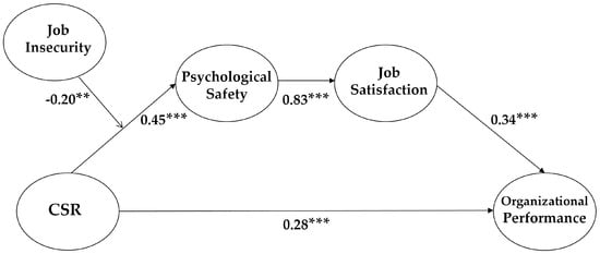 To test our hypotheses using structural equation modeling, we made a “moderated mediation model” that includes a mediation structure that led to CSR → psychological safety → job satisfaction → organizational performance with a moderation structure that proposes that job insecurity negatively moderates the association between CSR and psychological safety. This paper computed interaction terms by multiplying CSR and job insecurity with two variables centered on their means to decrease the multicollinearity [70]. Then, the current research tested the multicollinearity bias in CSR and job insecurity. Using SPSS, we computed the variance inflation factor (VIF) and tolerance to test if CSR and job insecurity have the problem [70]. The VIF values for CSR and job insecurity were both 1.02 and 1.02, which were lower than 10. In addition, the tolerance values were both 0.98 and 0.98, which were above 0.2. The results mean that the CSR, and job insecurity did not have the bias.