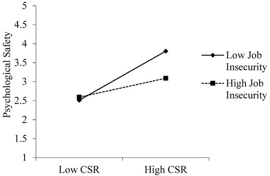 To check whether the moderating role of job insecurity on the association between CSR and psychological safety was significant, the current research built an interaction term between CSR and job insecurity by mean-centering and multiplying. According to the previous work [70], when the path from the interaction term to psychological safety is statistically meaningful, it indicates that job insecurity moderates the CSR-psychological safety link [70]. The value of the interaction term (β = −0.20, p < 0.01) demonstrated that the job insecurity negatively moderates the association. In other words, the association between CSR and psychological safety was weaker when the degree of job insecurity was high than the degree of it was low. The moderation effect is presented in Figure 3.