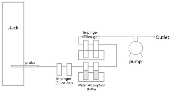 To measure the NH3 emission concentration at the sintering furnace COG gas outlets, the indophenol method was used in this study among the methods suggested for the measurement of NH3 emissions in the odor process test method and air pollution process test method of Korea [18]. The indophenol method is a method for estimating the NH3 content by measuring the absorbance of indophenols produced by the reaction with ammonium ions when sodium hypochlorite and phenol-sodium nitroprusside solutions are added to the sample solutions for analysis. For the NH3 sample collection, NH3 absorption solution (total 50 mL of boric acid solution for absorption) was added in two 50 mL volumetric flasks and flowed through 80 L of exhaust gas at 4 L/min for approximately 20 min using a mini-pump (SIBATA MP-ΣNⅡ, Japan). To remove the moisture contained in the gas discharged from the exhaust gas outlet of the sintering furnace, a desiccator bottle containing silica gel was connected in front of the NH3 sample collection device. The schematic for NH3 sample collection is shown in Figure 1. The absorptivity of the absorption solution used to collect NH3 at 640 nm wavelength was measured by through spectrophotometry (Shimadzu 17A, Japan). The accuracy of the spectrophotometry equipment is 0.5% of reading, and the linearity test results using ammonia standard samples 0.0009 mM/L, 0.0022 mM/L, 0.0134 mM/L, 0.0538 mM/L, and 0.0627 mM/L, R2 values showed high linearity with 0.9992.