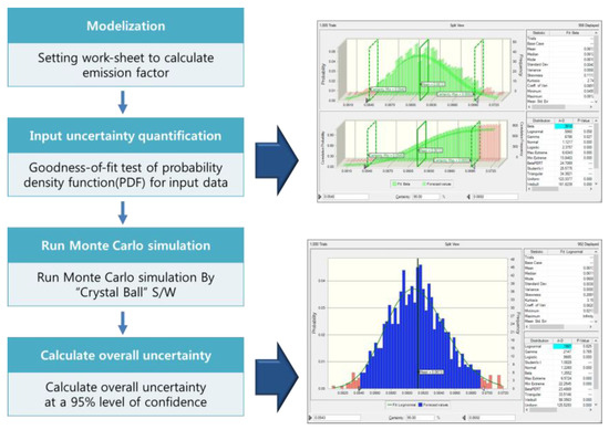 In this study, Monte Carlo simulation was used for the uncertainty analysis of the NH3 emission factor of the sintering furnace using COG from the steel works. Monte Carlo simulation is a method used to analyze uncertainties from the probability density function through the generation of random numbers. It is widely used for uncertainty analysis in the environmental science, especially for greenhouse gas [19,20]. Monte Carlo simulation can be analyzed in four stages, as shown in Figure 2. The first step is the selection of the model and the construction of the NH3 emission factor calculation worksheet. Second, the probability density functions of the input variables required for the development of the NH3 emission factor were tested through a suitability test. The significance level for hypothesis testing was selected at 95%, and each probability density function was calculated through a conformity test of data such as the NH3 emission concentration and the emission flow needed for NH3 emission factor development. The third step is to perform a Monte Carlo simulation, and a random sampling simulation was performed using the Monte Carlo simulation software, ver. 11.1.2.4 (Oracle Crystal ball, Oracle, Redwood City, California). The fourth step is to calculate the uncertainty range of the 95% confidence interval through the simulation results.