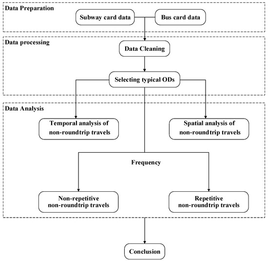 A review of other research showed that the use of SCD is quite comprehensive because of the smart cards record numerous boarding and alighting details, including the card ID, the timestamp of the boarding and the alighting, and technical details related to the ticketing machine []. Many researchers concentrated on commuting trips or roundtrips because there are more regularities that can be found in roundtrips. There are some seemingly abnormal trips that also have underlying patterns and imply travel rules. Scholars have also analyzed some strange travel patterns and the corresponding characteristics from unique aspects. A zero-inflated ordered probit model and a Cox proportional hazards model were estimated by Cheng [] based on the Nanjing Travel Survey data to investigate how the built environment affects active travel behavior. Some studies analyzed the reasons why some passengers often travel in excess []. Long et al. [] combined SCD with a household travel survey to focus on the travel patterns of four types of extreme transit behaviors: early birds, night owls, and tireless and recurring itinerants. Their results would help guide urban governance and planning. This study focuses on the non-roundtrip, which has not been studied by smart card data mining. We constructed a framework to analyze such trips by integrating subway and bus card data in order to obtain their temporal and spatial characteristics. We also analyzed possible reasons for generating such trips, which could help the decision-making process for transportation management departments.