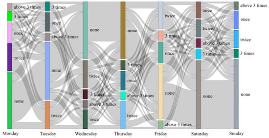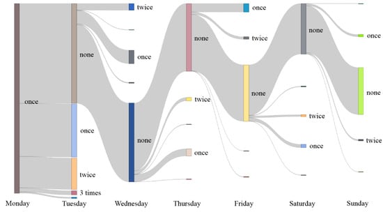 The trip frequency varied on different days in a week of the same cardholder. We classified cards used in the observed week into five groups according to the trip frequency in one day: no travel, once, twice, three times, and more than three times. We obtained the travel frequency shift pattern of passengers between groups during the week, as shown in Figure 2.