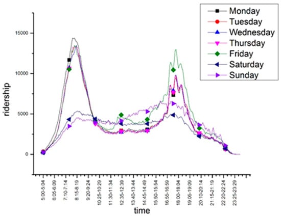Temporal patterns could be extracted by using the passengers’ boarding time recorded in the SCD. Previous research revealed that the temporal patterns of passengers’ boarding time had two peaks because the majority of these travels were commuting trips. The passengers’ boarding time distribution of non-roundtrip travels was quite similar, as shown in Figure 4. There were morning and evening rush hours on weekdays, with slightly more passengers in the morning. There were also two small peaks on weekends. Based on the differences in peaks on weekdays, there was an obvious passenger increase on Monday morning and Friday evening due to weekend activities, which is consistent with the general rule of residents in the traffic survey. Because of personal demands, people choose to alter routine trips after work on Friday and go back to work on Monday morning. Short breaks on the weekend increased the number of non-roundtrip travels that made up the overall demand.