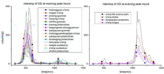 Based on the temporal features, we used K-means clustering algorithm to divide the top 20 ODs into two groups: the morning peak-oriented cluster and the evening peak-oriented cluster, demonstrated in Figure 6. The horizontal axis represents the total 1440 min for each day. Sixteen ODs clearly belonged to the morning rush hour, while the remaining ODs belonged to the evening rush hour. These trips are not totally random. They show a commuting pattern, rather than as rail access or egress of intercity transport hubs to finish an intercity trip.