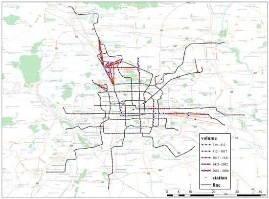 Table 5 lists detailed information of typical ODs, including path and distance. All ODs had one attribute in common. The origins and destinations of these ODs were located on the same subway line and close to each other, within about five stations. We selected the top 50 ODs based on their volume and visualized them on a GIS map using flow lines, as shown in Figure 7. The red lines are the connections between origins and destinations. The thickness of the line in the figure indicates the volume of the passenger flow, the thicker the line, the greater the volume of the passenger flow is. Arrows indicate the directions of the trips. Non-roundtrips mainly took place in two typical districts: the science and technology industry area, centered on Xi’erqi Station, and the CBD (Central Business District), centered on Guomao Station and Hujialou Station.