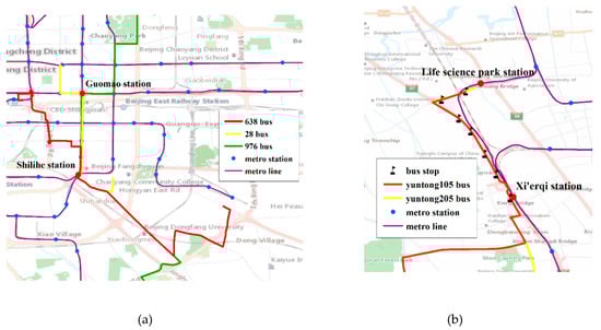 Relationship between a subway line and bus route: typical Origin–destination (OD) in (a) the science and technology industry area and (b) the Central Business District (CBD).