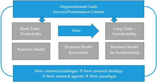 Considering the above, the paper’s scope was to develop a dynamic, multi-level conceptual framework (open to further improvements—inputs and/or corrections) suitable to be embraced by any (kind of) company searching for sustainable competitiveness. The main variables, as determined in the previous section, are: Organizational goals/performance, profit(ability), sustainability, business model/business model innovation, sustainable business model/business model for sustainability, new context/challenges, and new research agenda (Figure 2).