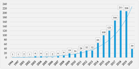 Searching on the Web of Science (WoS) for <<“Sustainability” AND “business model”>> returned a total of 1074 results/publications (Figure 3) between 1994 and (the first quarter of) 2020. A brief analysis of these records reveals the following features: