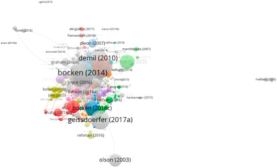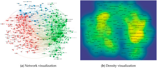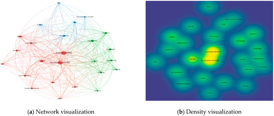 The bibliometric analysis was made using the VOSviewer version 1.6.15 software tool (https://www.vosviewer.com/), which is “a freely available computer program (…) developed for constructing and viewing bibliometric maps. (…It uses) the VOS mapping technique (…), where VOS stands for visualization of similarities” [83]. Regardless of its limitations [84], VOSviewer is increasingly used (either alone or together with other tools) by researchers in the fields of business and management to achieve systematic reviews [85,86]. Following an overall (quantitative) evaluation of the research in the field of <<“sustainability” AND “business model”>>, based on WoS Analyze Result tool, a more in-depth analysis—based on the VOSviewer tool—was made, capitalizing on the maps created for both text and bibliographic data. Once exported to VOSviewer, the results provided by WoS (containing Full Record and Cited References) became data sources for creating/generating new maps [87]: Text data were used to construct networks of co-occurrence links between terms, while bibliographic data were used to construct networks of co-occurrences of keywords and citations (of sources and documents).