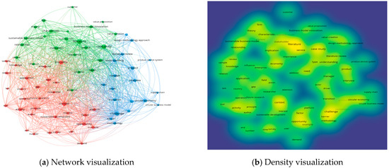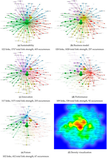 - In 2019 (208 records): 69 items were grouped into six clusters: Cluster 1 (14 items): Competitive advantage, corporate social responsibility, corporate sustainability, csr, entrepreneurship, green, impact, implementation, integration, knowledge, performance, responsibility, supply chain, sustainable development; Cluster 2 (13 items): Barriers, circular economy, drivers, economy, efficiency, industry, innovation, life-cycle assessment, of-the-art, opportunities, renewable energy, smes, sustainable business model; Cluster 3 (13 items): Business models, challenges, creation, design, develop, energy, firms, literature review, product-service systems, pss, servitization, strategies, sustainable business models; Cluster 4 (13 items): Business model, framework, information, insights, management, model, stakeholders, sustainability transitions, systems, technology, tool, transitions, transport; Cluster 5 (10 items): Business model innovation, future, industry 4.0, perspective, product, service, services, smart, strategy, value creation; Cluster 6 (six items): Collaborative consumption, consumption, evolution, platforms, sharing economy, sustainability; in terms of total link strength, the ranking of the top 10 items is: Sustainability, business model, innovation, circular economy, business model innovation, design, framework, management, future, perspective.