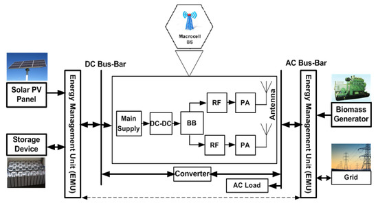 In this work, a two-tier downlink long term evaluation (LTE) cellular macro base station with hexagonal shape has been considered. The architecture of the proposed system with 2/2/2 antenna patterns is shown in Figure 1. In general, the BS consists of transceivers (TRXs) unit, power amplifiers (PAs) unit, a radio frequency (RF) unit, a baseband (BB) unit for processing and coding signal, and a DC-DC power supply [56]. The macro-BSs are powered by a hybrid solar PV/BG scheme along with a smart energy management unit (EMU), inverter, and sufficient storage devices. An EMU is used to protect the battery from overcharging and deep discharging. The BS is generally a DC load, but it also includes some AC loads as auxiliary equipment, such as air conditioning and lighting. Here, we consider a 30-W AC lamp only, which is connected to the BS from 6 PM to 6 AM. For the remote radio head (RRH)-enabled macro-base station, no cooling system is required since a fiber optic link is established instead of a coaxial cable between the antenna and baseband unit. Besides, an electrical grid system is connected to the hybrid PV/BG system in a bidirectional way for exchanging electricity selling facility to the grid during surplus production and scarcity in order to ensure reliable operation. The term 2/2/2 represents a three-sector site with two antennas per sector.