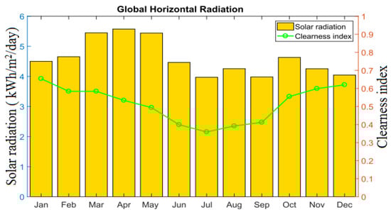 where is the solar PV panel-rated capacity in kW, PSH is the peak solar which is similar to average daily solar irradiation, and is the derating factor of the solar PV panel. There are many derating factors in a PV system design such as thet environment, PV system, installation, cost, etc. In this work, a standard value of derating factor 0.9 is used for dimensioning solar PV panel. The term dimensioning of solar PV panel means the optimal sizing of the solar PV panel. Figure 2 depicts the annual solar radiation profile along with the clearness index (CI) of the selected area. The average value of solar intensity and clearness index of the considered location are respectively 4.59 kWh/m/day and 0.503, which imply that Bangladesh has a better opportunity for producing electricity from sunlight. The required number of solar PV panels () to produce a specific output () can be formulated as follows [30]: