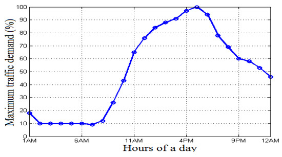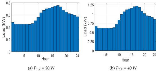 Modeling and dimensioning of the sustainable supply system depends heavily on the BS power requirement. In a practical cellular network, incoming traffic profile is time-varying and energy consumption by the BSs is directly related to the traffic volumes as shown in Figure 3. The total power consumption of a BS as a function of traffic intensity () can be represented as follows [56]: