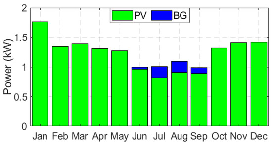 In this subsection, the performance parameters of the proposed hybrid PV/BG system are compared with the standalone solar PV, hybrid PV/WT, and hybrid PV/DG for ensuring the validity. For presenting a clear view, different power providing schemes have been simulated under the same network setting considering the average solar intensity and biomass profile. A quantitative comparison of technical criteria including the optimal size is summarized in Table 11 for the aforementioned supply system that is obtained from the HOMER software. As is seen, the optimal architecture of the proposed system is in a feasible range and remains almost close to the other supply schemes, which ensure the effectiveness of the system. Noticeably, a large number of solar PV panels are required in order to satisfy the BS energy demand for both standalone solar PV and hybrid PV/DG-powered systems, leading to a remarkable enhancement in NPC and COE.