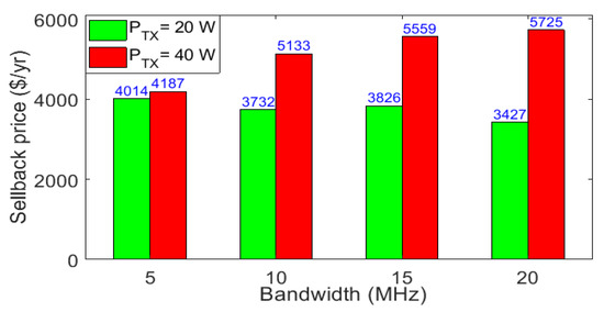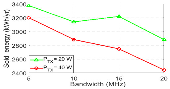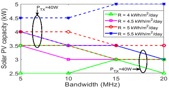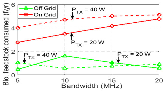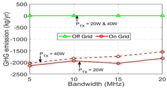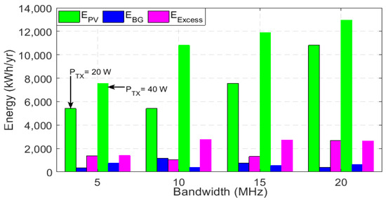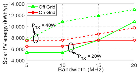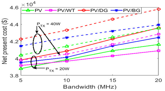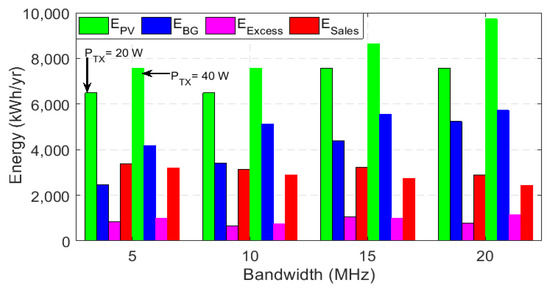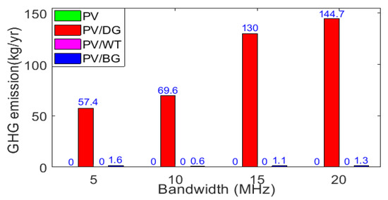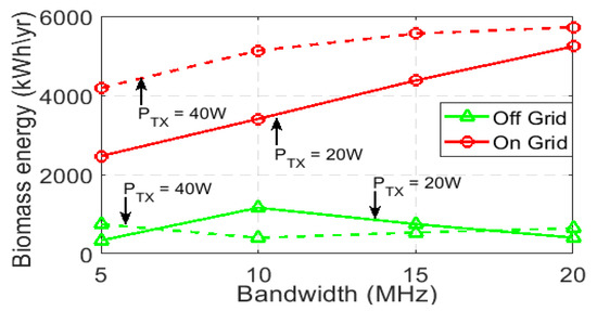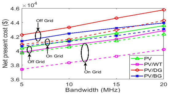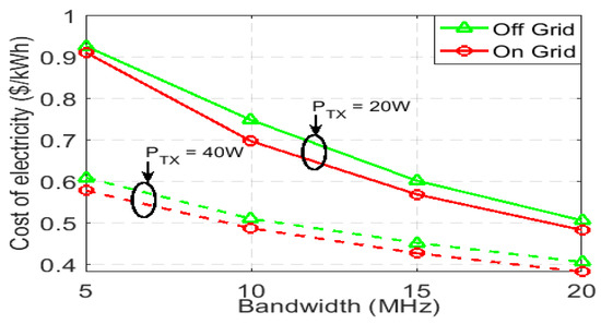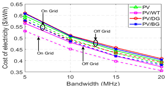 A detailed comparison of the cost of electricity under different supply schemes is illustrated in Figure 33 and Figure 34 along with the variation of system bandwidth and transmission power. It is observed that the COE curves are in the lower position for the grid-tied system, which implies that the grid-connected hybrid PV/BG scheme attains optimistic results wherein standalone solar PV exhibits average results. In line with our expectation, the hybrid PV/DG scheme provides poor value and hybrid PV/WT represents superior performance. Though results show the best output for the hybrid PV/WT system configuration, this hybrid system is not feasible because of the complicacy of the WT setup and low-speed wind graph in the selected location. On the other hand, the hybrid PV/BG system provides greater reliability compared to the standalone solar PV system because the single energy technology source solar energy generation may be outage depending on the weather condition. As a consequence, the hybrid PV/BG system is an attractive solution for powering the macro-BS.