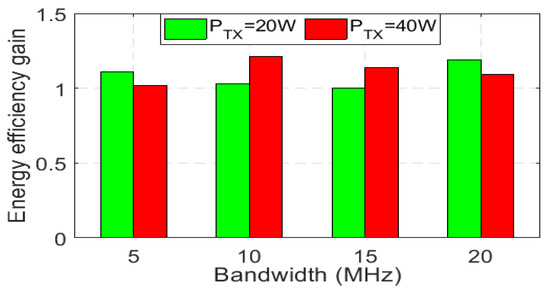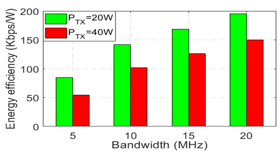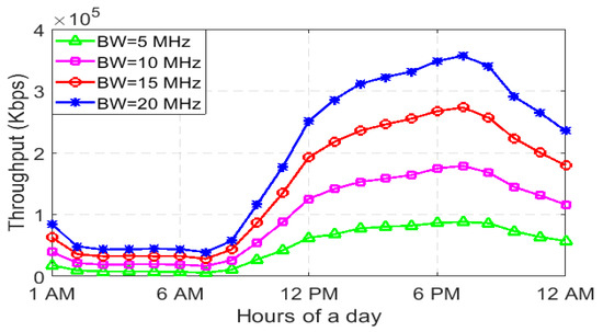where is the net power consumed in all the BSs at time t, which is estimated using Equation (11). The performance metrics such as throughput, spectral efficiency, and energy efficiency of the introduced networks are evaluated with the help of Monte-Carlo-based MATLAB simulation. The simulations are performed by averaging above 10,000 iterations considering the realistic traffic profile. It is also considered that each user is associated with at least one resource block (RB). Table 4 summarizes the key parameters of the simulation process.
