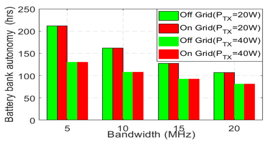 The battery bank autonomy () is another key factor in order to determine the potential number of days that the battery bank can feed the BS load requirement without any support from the hybrid system and is formulated as follows [58]: