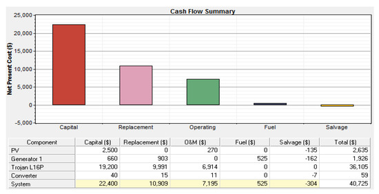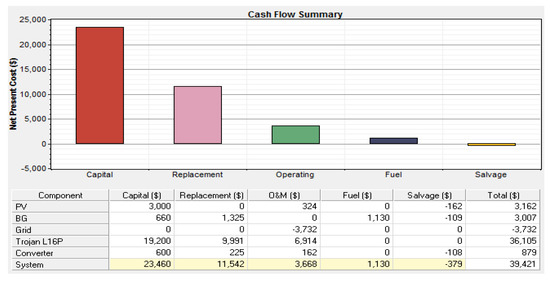In this work, HOMER optimization software has been used to determine the optimal architecture of the hybrid solar PV/biomass scheme that satisfies user-specified constraints with the lowest net present cost (NPC) including the initial capital costs (CC), replacement costs (RC), operation and maintenance costs (OMC), and salvage value (SV) during the project lifecycle. The net present cost of the system can be computed as follows [58]:
