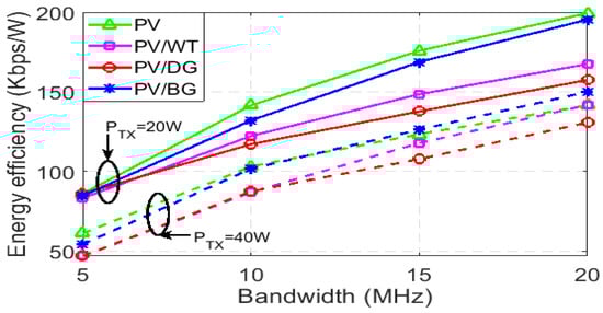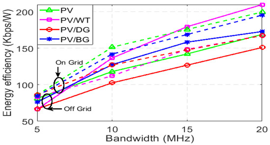 A quantitative comparison of energy efficiency performance among the different supply systems taking the effect of dynamic traffic profile into accounts is demonstrated in Figure 37 and Figure 38. These two graphs illustrate that the hybrid PV/BG scheme provides a satisfactory level of EE performance as compared to the hybrid PV/DG and hybrid PV/WT system. It is also observed that the standalone solar PV provides superior EE performance than the other supply schemes due to the smaller amount of losses and excess electricity. Finally, the lower system BW and transmission power uplift the EE performance of the system under all cases.