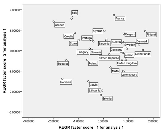 In Figure 4 we plotted the component scores for the two factors and identified the groups of countries with similar or opposite behavior, considering the set of variables. Two groups of countries can be observed: One is formed by Romania, Bulgaria, Croatia, Spain, Greece, Italy, and it is opposed to the group composed by Finland, Denmark, Netherlands, Belgium, Sweden, Ireland, UK, and Luxembourg.