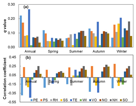 The influence of each driving factor on PM2.5 concentrations was acquired by calculating the corresponding q value (the power of determinant, Figure 1a), which indicated the contribution of each impacting factor on PM2.5 concentrations. Figure 1 shows that there were obvious seasonal and annual difference in factors’ impacts on PM2.5. Meteorological conditions were dominant impacting factors in PM2.5 formation at the annual time scale. TE (q = 0.27) was the primary impacting factor, followed by PE (q = 0.22) and PS (q = 0.17).