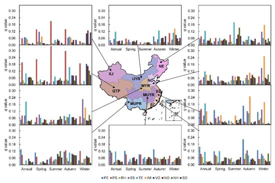 The q values of impacting factors at the annual and seasonal time scales in 10 regions of China. Note: VO denotes VOCs; NO denotes NOx; NH denotes NH3; SO denotes SO2.