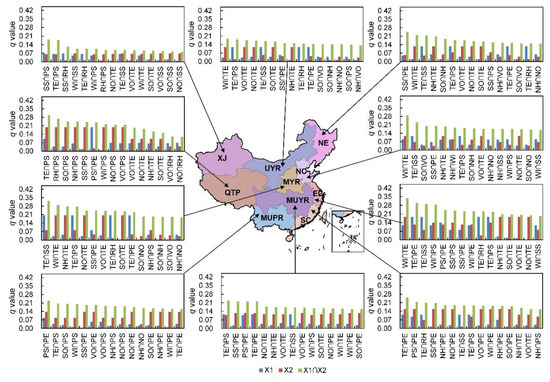 In this study, the q statistics of GeoDetector were used to quantitatively analyze the impacts of AP and MCs on PM2.5 in China. GeoDetector supports a series of statistical methods that can explore spatial difference and identify the driving factors. The main idea is based on the assumption that if an independent variable (X) causes a dependent variable (Y), then the spatial distribution of the independent variable and the dependent variable should be consistent [57,58,59,60]. GeoDetector can detect both qualitative data and numerical data. Compared with traditional linear statistical methods, this is a major advantage of GeoDetector. Another unique advantage of GeoDetector is the ability to detect the interaction between two factors acting on the dependent variable. The GeoDetector includes four detectors, which are factor detection, risk area detection, ecological detection, and interaction detection. In this study, factor detection and interaction detection were used.