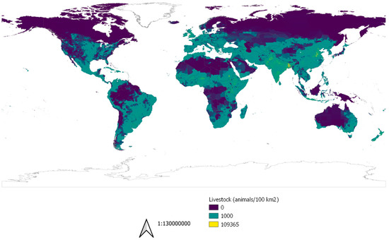 - Gilbert, M.; Nicolas, G.; Cinardi, G.; van Boeckel, T.P.; Vanwambeke, S.; Wint, W.G.R.; Robinson, T.P. Global Cattle Distribution in 2010 (5 Minutes of arc); Harvard Dataverse, V3; 2018. [Google Scholar] [CrossRef]