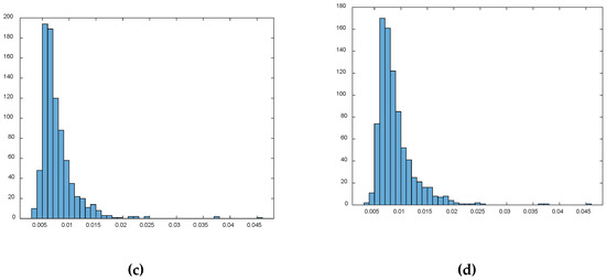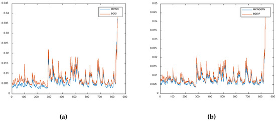 Comparison of the distributions of daily conditional volatilities: (a) MWXO; (b) BGEI; (c) MXWO0FN; (d) BGEIF. Source: Authors’ work. Source: Authors’ calculations.