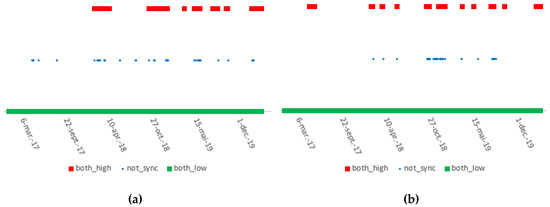 The high level of synchronization of the daily volatility regimes is confirmed by Figure 3 below, where we present for each observation in our sample whether the volatility regimes of the two biomes of variables (BGEI vs. MXWO and BGEIF vs. MXWO0FN, respectively) were at the same level (both high or both low) or were decoupled. Going into detail, we observe that for only 48 out of 834 observations (that is, 5.76% percent of the time), the volatility regimes of the gender equality indices were not in sync with the overall MSCI indices. As previous studies concluded, the volatility regimes of the cross-sectoral indices were not necessary aligned with the ones of the financial sector indices (confirming the different behaviour of financial sector equity indices, which are more volatile in comparison with cross-sectoral diversified ones).