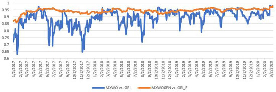Our results show not only that volatility and volatility regimes of gender equality indices are corelated with overall MSCI indices, but also with the returns themselves. The value of the Pearson linear correlation coefficient for the entire sample of daily returns is 0.942 for the pairing of MXWO and BGEI and 0.953 for the pair made by MXMO0FN and BGEIF, respectively (see Appendix A, Table A3). Furthermore, the study of the daily conditional correlations computed using a DCC MV GARCH (1,1) model as described in stage three of our methodology confirms that, during the entire period investigated by us, the conditional correlations between the gender equality indices and the overall MSCI indices were very high, indifferent of the volatility regime (see Figure 4 below). While the correlations among the financial indices appear to be more stable over time in comparison with the correlations among cross-sectoral indices, the conclusion remains that for the entire period the daily returns of the gender equality indices show a high level of linear correlation with the overall MSCI indices.
