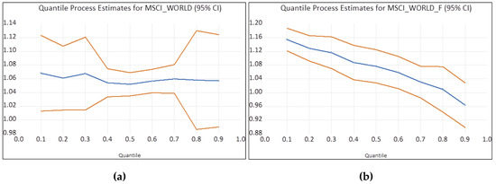 As described in the literature on financial econometrics, linear regression describes the average linear relationship between a combination of explanatory variables and a dependent variable relying on the conditional mean expressed as E(y|x). Because this method only offers a partial explanation of the relationship, we were interested to investigate the values of the slope coefficients between the gender equality indices and the overall market indices at several percentiles of the conditional distribution of these series, and the quantile regression is one of the tools available to do this.