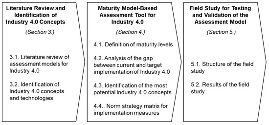 The paper is structured as follows: after a first introduction to the topic in Section 1, the authors provide in Section 2 the research methodology for this work. Section 3 follows a literature review of existing assessment and maturity models, as well as for the identification of Industry 4.0 concepts and technologies. Section 4 provides a detailed insight into the structure and development of the proposed maturity level-based assessment tool. Section 5 describes the evaluation and testing of the developed model in several industrial companies. Section 6 provides a discussion about the proposed model, the implications for practitioners, as well as its limitations. Finally, the paper ends with a summary and a look at further research needed in the future.