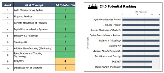 In this respect, the estimation of the importance is used to express the potential of each Industry 4.0 concept for the individual SME. To prioritize the Industry 4.0 concepts and thus to define the basis for implementation measures, the assessment tool automatically generates a ranking based on the identified potential (see Figure 5).