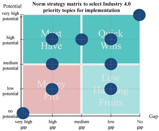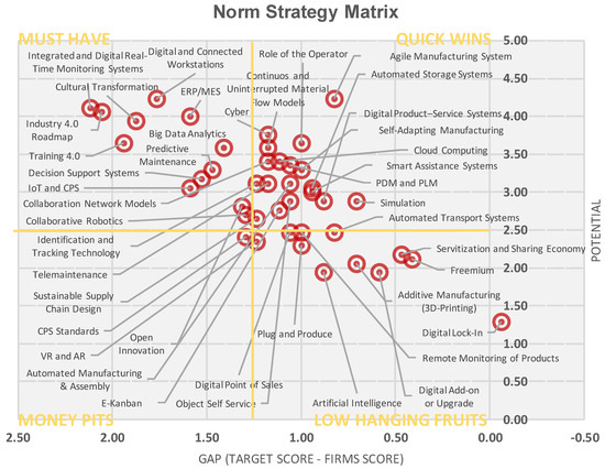 In the third step of the field study, we combined the average data of the Industry 4.0 gap and the identified potential to generate the norm strategy matrix (see Figure 9). In principle, it can be seen that none of the Industry 4.0 concepts mentioned had a low potential and a large gap in implementation. This means that it makes sense to introduce all of the 42 concepts in the long term. There are a few so-called "low hanging fruits" that have a moderate potential with little effort for introducing the target level (which might be high or moderate according to the needs of SMEs). Examples of such concepts are additive manufacturing, servitization and sharing economy, digital upgrade, freemium, or artificial intelligence. It might sound surprising that a technology like artificial intelligence is clustered as a low hanging fruit technology. Here, it must be specified that SMEs in this field study defined a relatively low target level for artificial intelligence. The matrix also showed some concepts that can only be implemented with great effort, but which require a long-term "must have" strategy due to their high potential. Examples for this norm strategy are big data analytics, predictive maintenance, collaborative robotics, real-time monitoring systems, digitalized workplaces, improvement of their ERP, the introduction of MES systems, as well as a cultural change of the company towards developing an Industry 4.0 roadmap and qualifying their people with Training 4.0. The large number of Industry 4.0 concepts mentioned fall within the norm strategy “quick wins”, which means that the effort for introduction is relatively moderate, but the concepts show a high potential. Examples of concepts where it makes sense to apply this strategy are agile manufacturing systems, automation, e-kanban, operator 4.0, simulation, cloud computing, smart assistance systems, as well as appropriate cybersecurity solutions for SMEs.