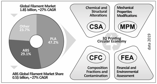 Furthermore, Figure 1 presents a 3D printing circular economy model, with the four main parameters affecting the process; that is, the chemical and structural alterations, mechanical properties modifications, composition fractions and contamination, and financial and environmental assessment. All these parameters are crucial for the economy of the recycling process and the material’s behavior after it is recycled.