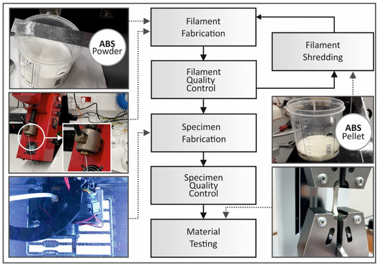 For the current research, the ABS powder was used to produce a virgin ABS filament via the extrusion process. The produced filament passed through a quality control inspection to ensure that the tolerances in the required 1.75 mm diameter are within the extruder vendor specifications and that it has a smooth surface finish. Part of the initial ABS filament was used to produce the test specimens via 3D printing. The specimens were thoroughly measured and analyzed regarding their dimensions and their physical properties (i.e., color, surface finish). Tensile, compression, flexion, impact and micro-hardness tests were conducted in order to evaluate the mechanical properties of the 3D-printed virgin ABS specimens.